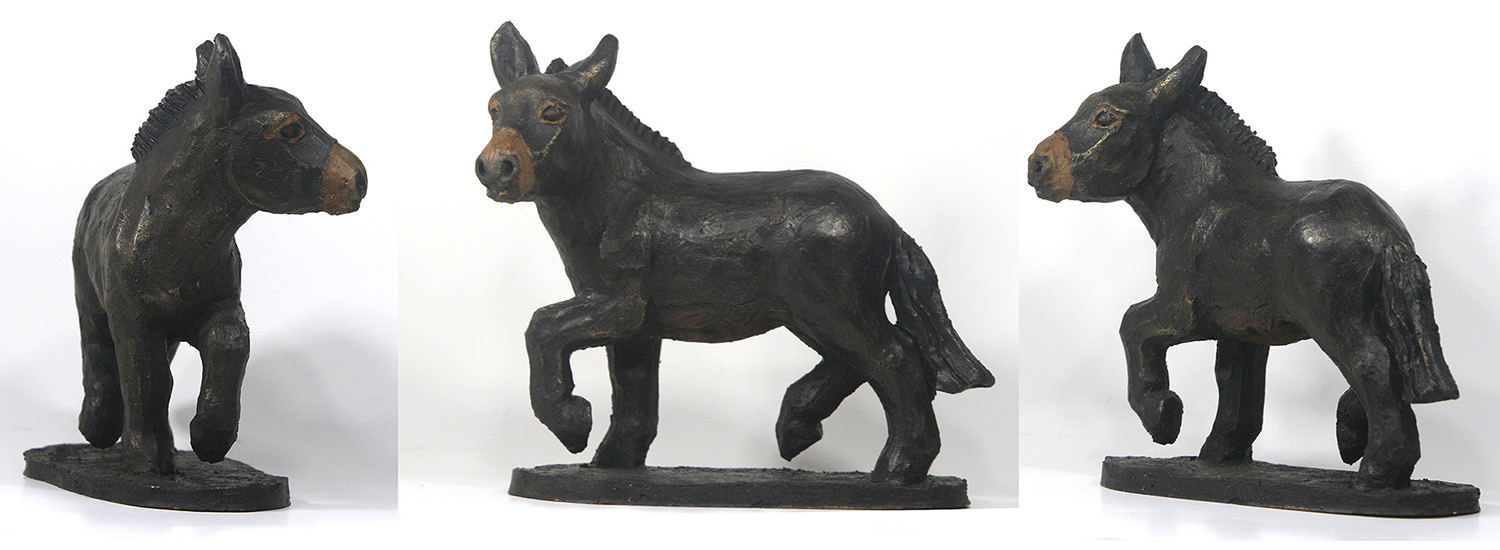 La pièce est en terre cuite non patinée pour vous laisser le choix (par exemple une patine colorée d'après les photos de votre âne. Demandez-moi un devis) |